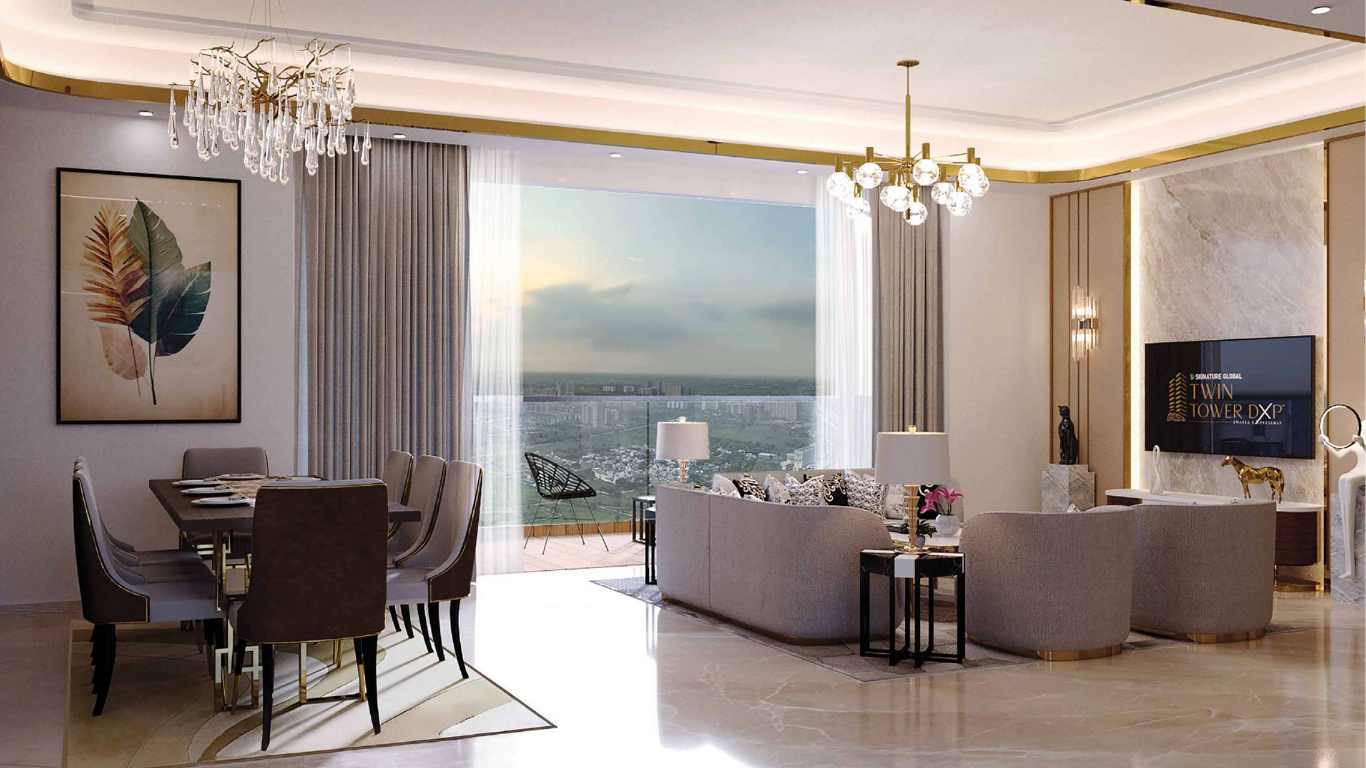 The Signature Global Twin Tower DXP is an ultra-luxury residential project located in Sector 84, Gurugram, right along the rapidly developing Dwarka Expressway corridor. Developed by Signature Global Group, one of India's most trusted real estate brands, Twin Tower DXP aims to redefine high-rise luxury living in Millennium City. Spread across nearly 5 acres, the project comprises two magnificent towers soaring up to 45 floors, offering a breathtaking view of the city skyline. It presents a premium collection of 3 BHK, 3.5 BHK, and 4.5 BHK luxury residences, each meticulously designed to reflect contemporary sophistication and architectural brilliance. Designed by renowned international architects, the project blends modern aesthetics in harmony with practical functionality. The residences range between 2,650 sq. ft. and 3,785 sq. ft., boasting expansive layouts, 12-foot ceiling heights, and large deck balconies that seamlessly connect indoor and outdoor living spaces. Italian marble flooring, VRV/VRF air conditioning, modular kitchens, and smart home automation are featured in each apartment to ensure residents enjoy the perfect mix of style, comfort, and technology.